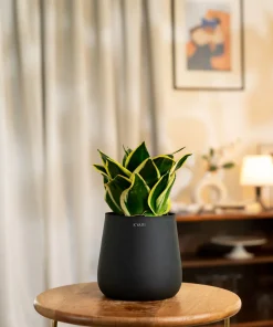 Snake plants thrives in bright, indirect light but can tolerate low light conditions. Water every 2-3 weeks, allowing the soil to dry out completely between waterings. Water more frequently in brighter light. Adaptable to average household humidity levels.