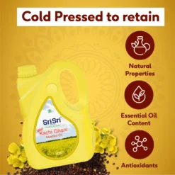 • The Kachi Ghani Mustard Oil produced by Sri Sri Tattva has the essential oil content of Mustard Oil which acts as a preservative, displays antibacterial and antioxidant properties. Kachi Ghani is the ‘cold press’ extraction process wherein mustard seeds are crushed at a low temperature so that the natural properties, antioxidants and essential oils are retained in the oil. Sri Sri Tattva Kachi Ghani Mustard Oil is rich in monounsaturated and polyunsaturated fats, fortified with Vitamin A & D and free from Argemone Oil.