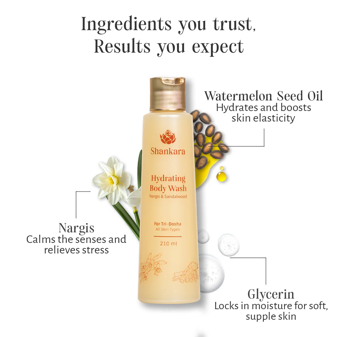 Step into a refreshing shower ritual with our 100% natural, sulphate & paraben-free Hydrating Body Wash, where Watermelon Seed Oil, Sandalwood, and Aloe Vera cleanse, hydrate, and nourish your skin. The delicate floral fragrance of Nargis, once cherished by queens and kings, is now woven into your everyday ritual. Indulge in a sensorial shower experience that leaves your skin soft, and your mind relaxed.