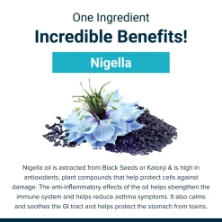 Nigella oil is extracted from Black Seeds or Kalonji and is high in antioxidants, plant compounds that help protect cells against damage. The anti-inflammatory effects of the oil helps strengthen the immune system and helps reduce asthma symptoms. It also calms and soothes the GI tract and helps protect the stomach from toxins.